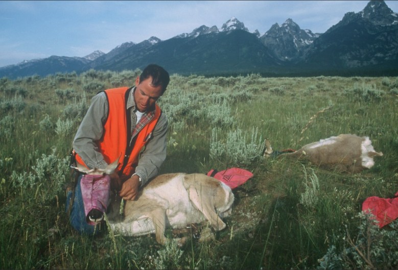 Doug Brimeyer, left, converses with Hall Sawyer during a 1998 pronghorn capture operation in Grand Teton National Park. The migratory animals are part of the broader Sublette Herd. (Mark Gocke/Wyoming Game and Fish Department)