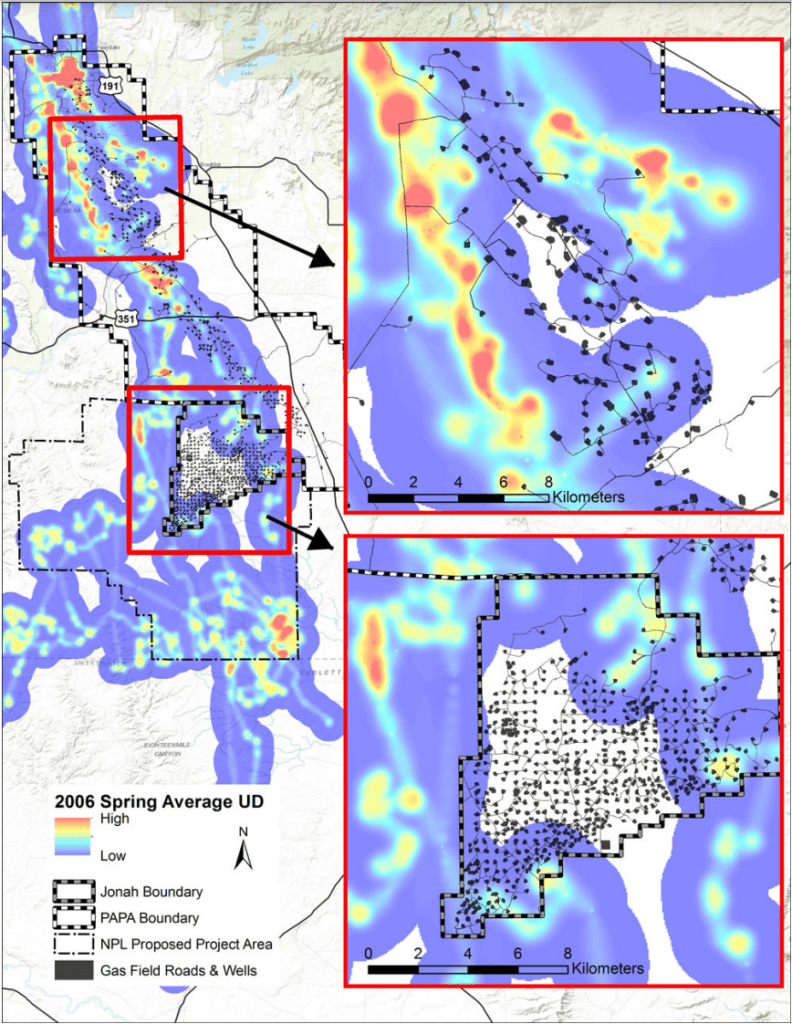 Now the executive director for the Jackson Hole Wildlife Foundation, Seidler specifically examined how pronghorn used the then-proposed NPL project area during her time at the Wildlife Conservation Society. Publishing the results in the journal of Conservation Biology, she illustrated how pronghorn were using the NPL while simultaneously avoiding the drilled-out Anticline gas field and especially densely drilled Jonah field.