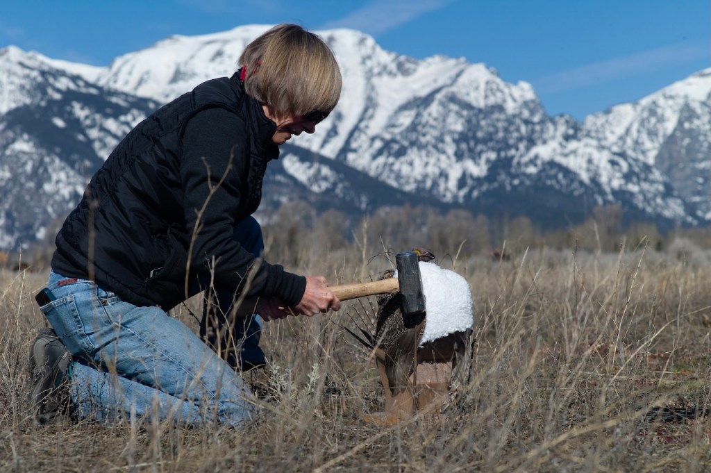 Becky Hawkins anchors a grouse decoy south of Jackson Hole Airport in Grand Teton National Park on March 20, 2026. Biologists hope to attract strutting grouse to a new breeding-ground lek away from air traffic. (Angus M. Thuermer Jr./WyoFile)