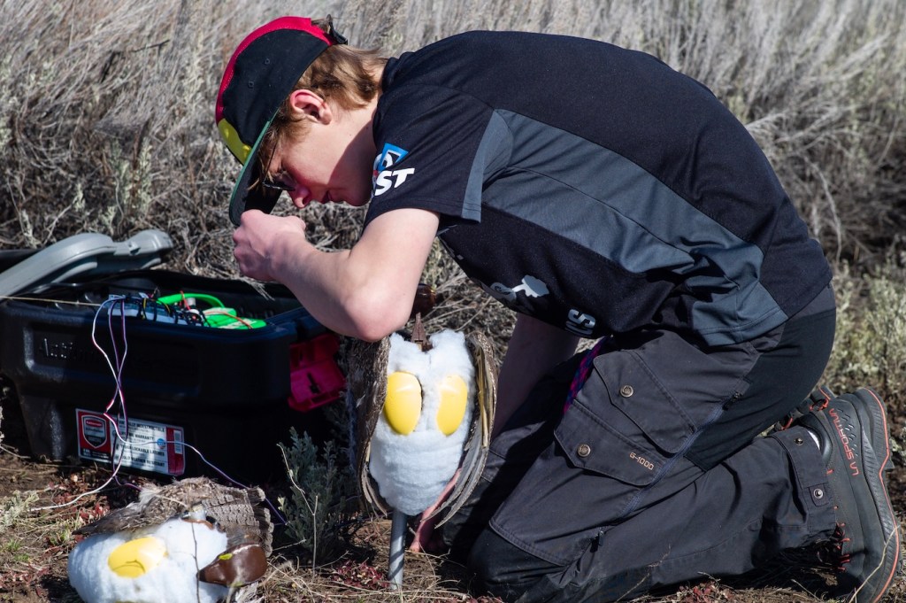 River Ryan connects wires to animate a robo-grouse south of Jackson Hole Airport in Grand Teton National Park on March 20, 2026. (Angus M. Thuermer Jr./WyoFile)