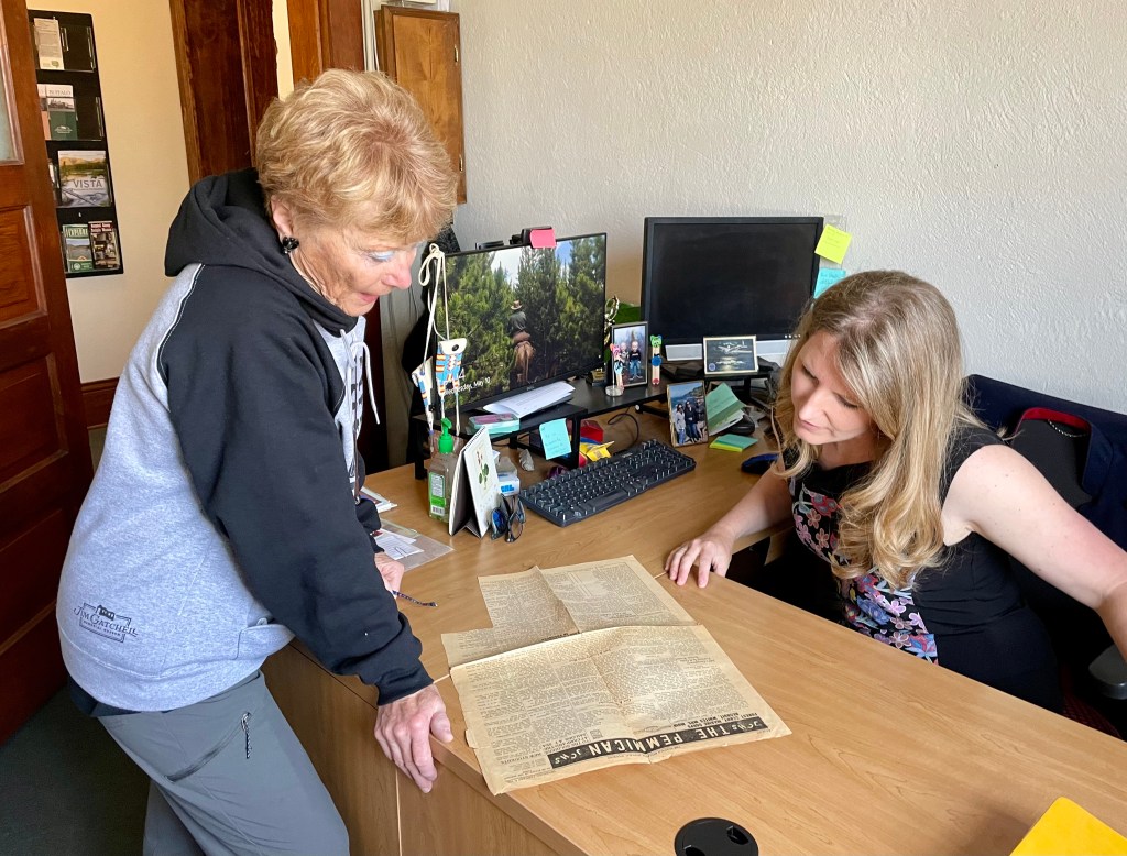 Sylvia Bruner (right) and Susan Theune, a museum volunteer, examine a 1941 edition of the local high school’s paper, The Pemmican, in Bruner’s office at the Jim Gatchell Memorial Museum on May 10, 2023. (Maggie Mullen/WyoFile)