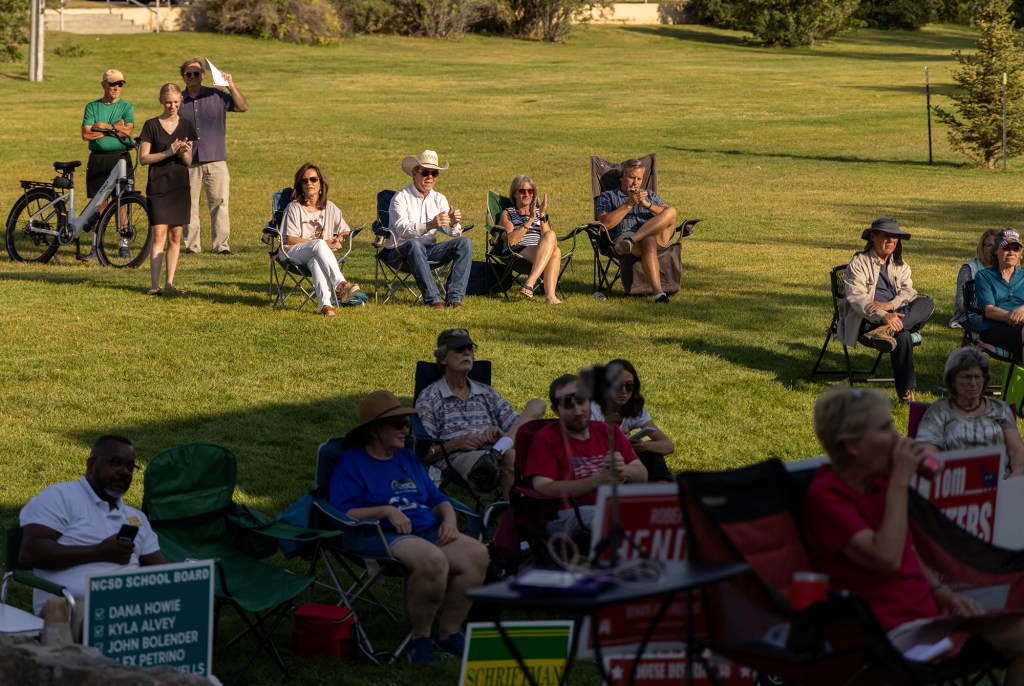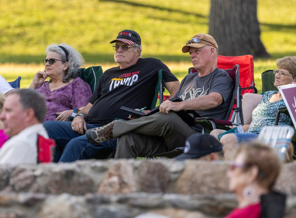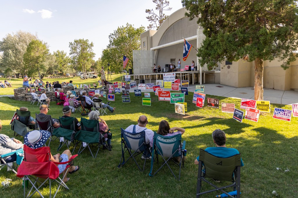A food truck was parked by the bandshell. The crowd of about 30 people, mostly seniors, gathered on the shaded lawn in their camping chairs. Dozens of campaign signs were pierced into the greenery. The American and Wyoming flags framed the stage. The candidates, including two from another local House race, looked small and vulnerable onstage.