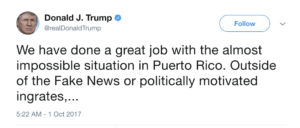 Amid all the lies, hypocrisy, and incompetence however, what sent me over the edge about Trump were tweets about Puerto Rico. American citizens who have lost their homes and struggle to survive without food, water or power were accused by the president of wanting “…everything to be done for them when it should be a community effort.” When San Juan Mayor Carmen Yulin Cruz made an impassioned plea to the world to help the island he attacked her too. “Such poor leadership ability by the Mayor of San Juan, and others in Puerto Rico, who are not able to get their workers to help.” He labeled detractors, some of whom are literally dying for lack of aid and basic services, as “ingrates.” And he did it all via Twitter, from a golf course.