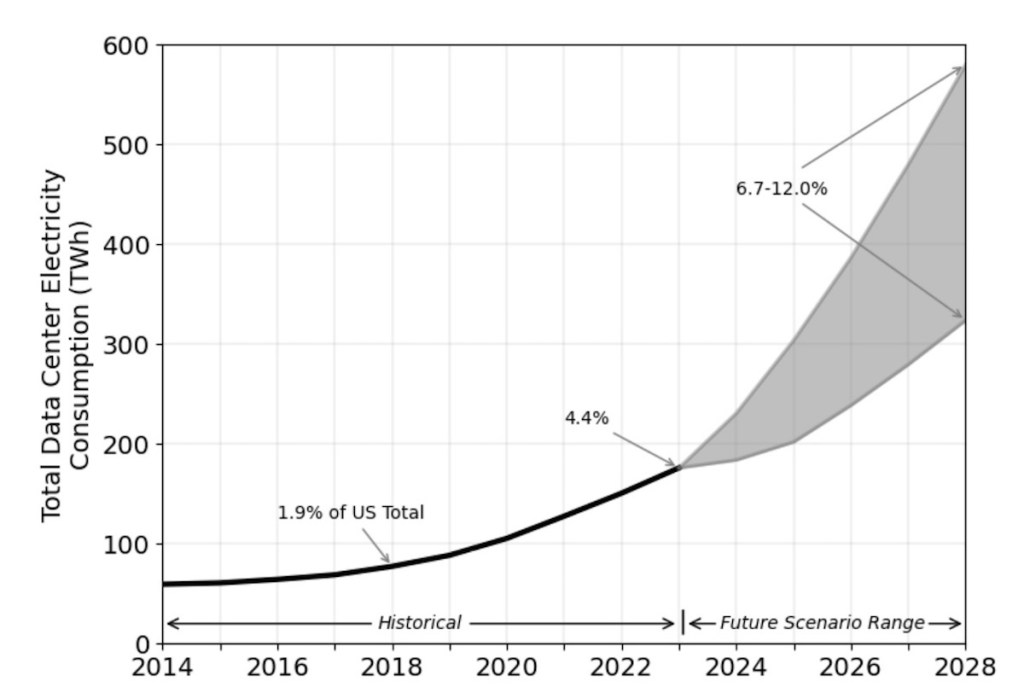 After more than a decade of relatively flat electrical demand in the U.S., AI queries, digital streaming, bitcoin mining and other computations — along with systems to cool hard-working servers — increased to account for 4.4% of all U.S. electrical consumption in 2023, according to the Department of Energy’s 2024 Report on U.S. Data Center Energy Use. The report estimates that by 2028, those computations will account for 12%.