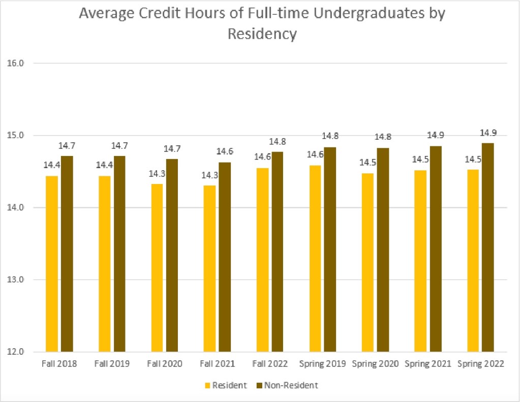 In recent years, in-state UW undergraduates have averaged 14.5 credits per semester, while out-of-state students have averaged 14.9 credits.
