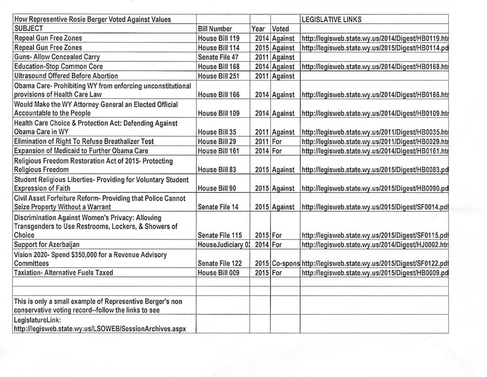 Rep. Rosie Berger (R, HD 51, Big Horn) who had served 14 years in the Legislature and was considered likely to be the Speaker of the Wyoming House in 2017, found herself in one such race. Her opponent, Bo Biteman, received $2,900 in cash from the Brophys. Daniel Brophy also paid for Biteman to set up his website, according to pre-primary campaign filings.