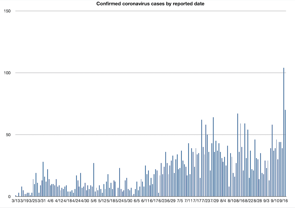 The Wyoming Department of Health announced 104 new lab-confirmed cases Wednesday, a number far above the state’s previous single-day record of 67, which was set Aug. 14. The record day was followed Thursday by 70 new lab-confirmed cases.
