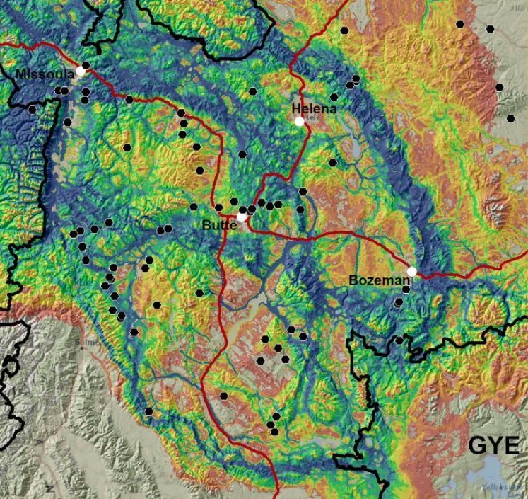 The modeling predicted grizzly bear use of linkage areas based on several habitat qualities, but foremost was the greenness of the landscape. Mountains, forests and riparian areas rank higher, whereas sagebrush steppe and high plains environments rank lower.