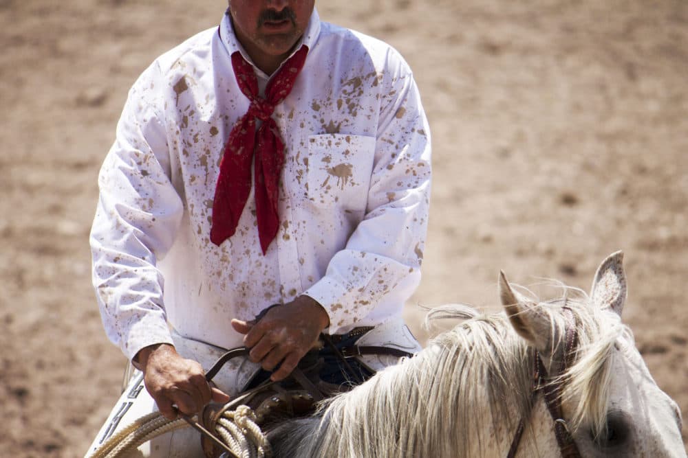 RoseMarie London’s rodeo photos show unusual aspects of the sport. She uses color and tight cropping to reveal aspects we don’t see in promotional brochures. No stereotypical bucking broncos here. London shows less dramatic moments. A cowboy’s neat white shirt is flecked with mud. Another cowboy is shown from the rear as he is rescued from his bronc at the end of a ride.