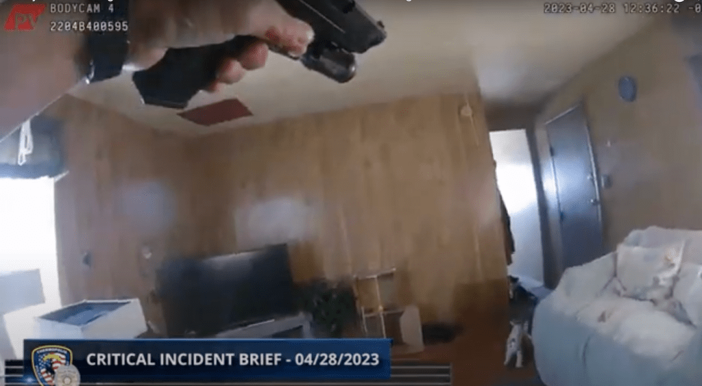 Brandi Laramore hid in the home’s bathroom. According to the DCI report, she took the family dog into the bathroom with her. But in a frame from the body camera footage, the dog runs across the trailer floor as Mascorro, now standing, aims his gun toward Laramore.