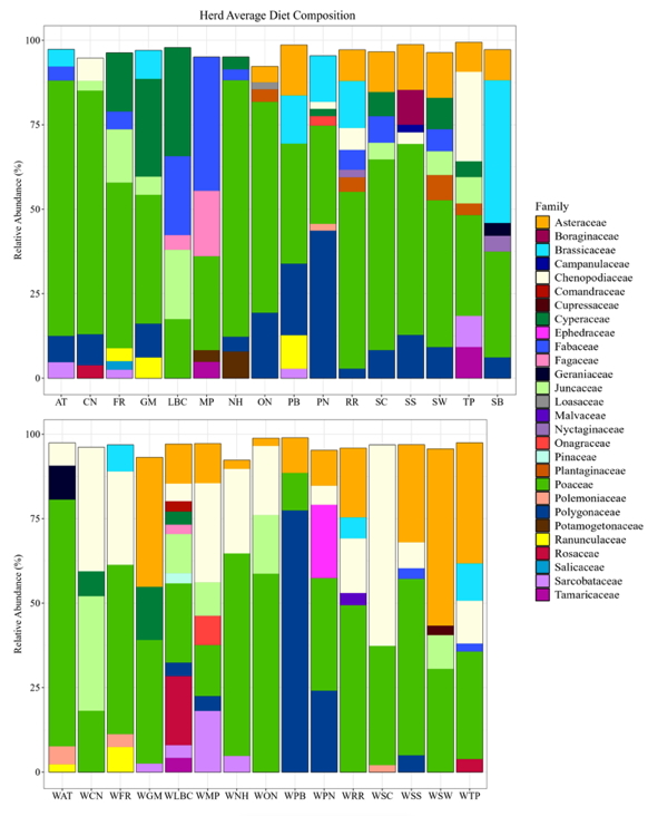 What wild horses eat varies dramatically, both seasonally and across their range, as illustrated in this graph of 16 herds’ diet composition. Summer is up top, winter is down low and the scientific names of plant families are on the legend at right. (Rangeland Ecology and Management)