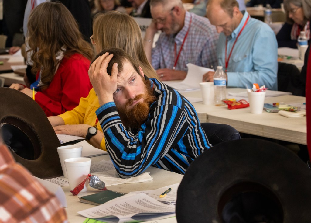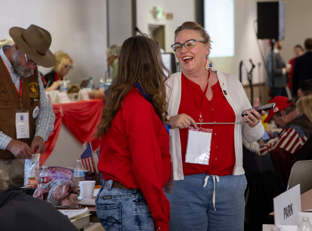 It was past noon on a cloudy, spring Saturday. Ham sandwiches and potato salad served on paper plates awaited the more than 300 Republicans gathered to decide the party’s business. Some of Wyoming’s top elected Republicans would soon give remarks, Miller said into a microphone, as is tradition when the party meets every other year for its statewide convention.