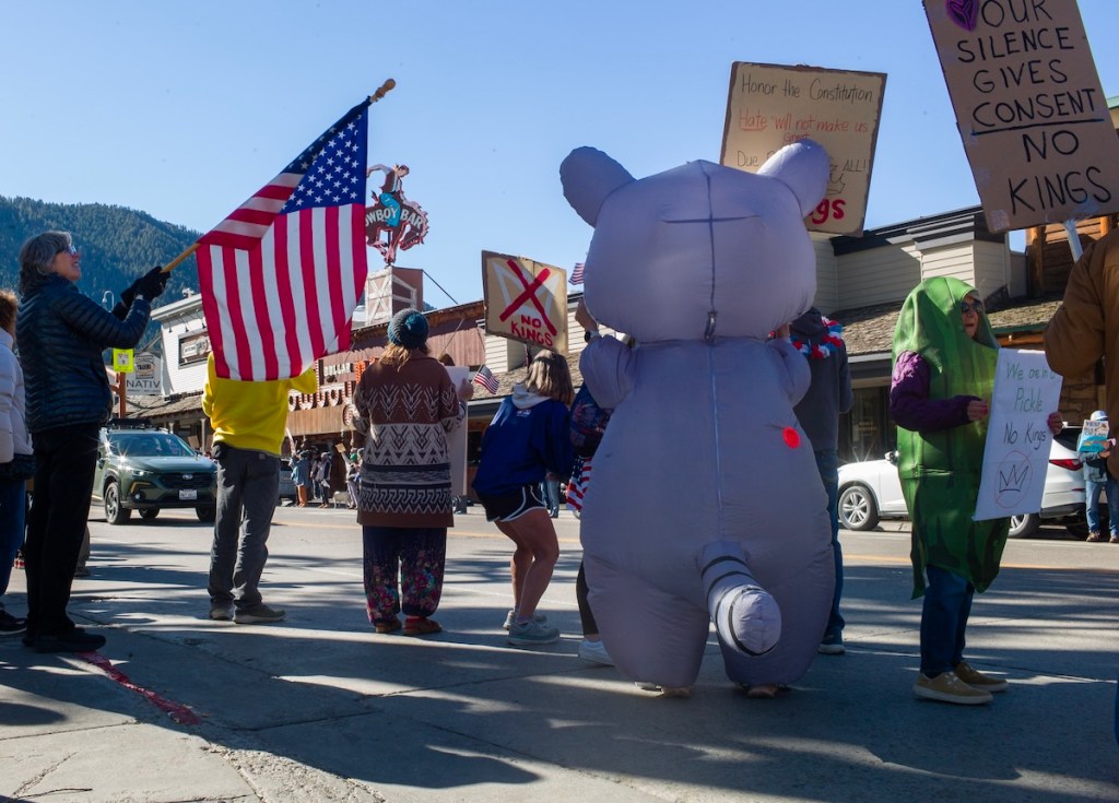 Hundreds of Wyomingites rallied in streets and parks, on sidewalks and boardwalks in the nationwide No Kings Day of protest Saturday, declaring love for their country and saying “No!” to what they characterize as President Trump’s monarchical ambitions.