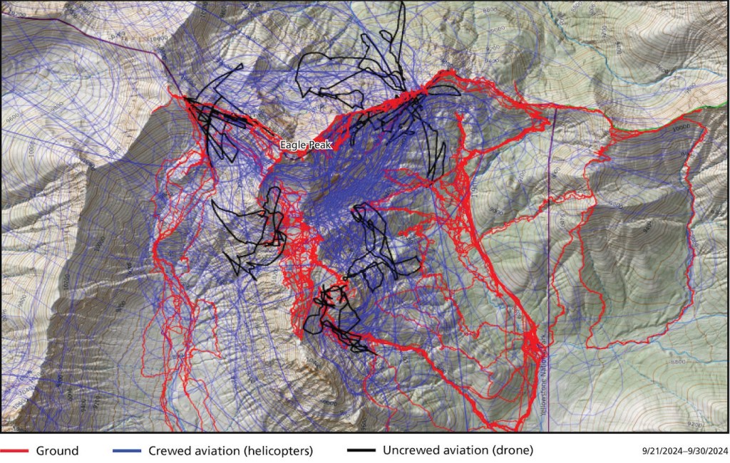 Since the search launched on Sept. 21, more than 100 people have taken part in the effort with helicopters, search dogs, spotting scopes, trackers and a drone. The effort has logged more than 3,225 air and ground miles in the remote and mountainous area near Eagle Peak.